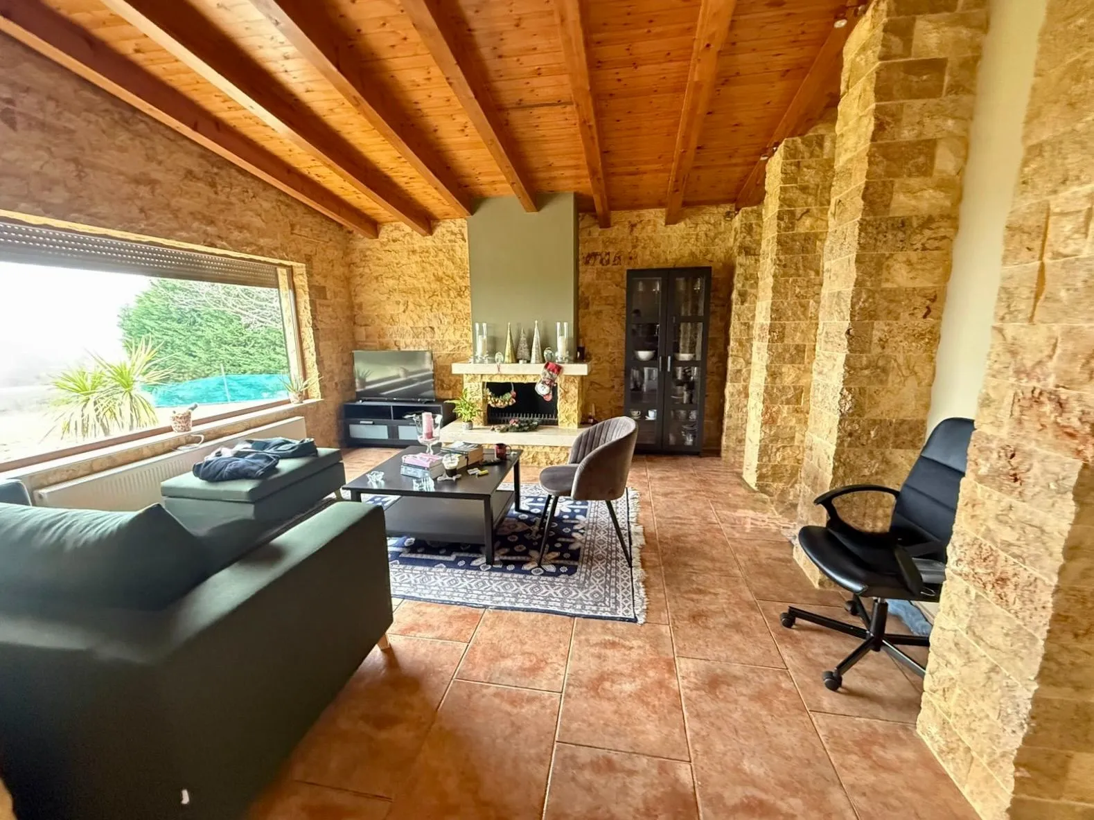 Το σπίτι διαθέτει τρία υπνοδωμάτια, δύο μπάνια, ευρύχωρο σαλόνι με εσωτερική σκάλα και δύο τζάκια (στο σαλόνι και σε ένα από τα υπνοδωμάτια), καθώς και ανεξάρτητη κουζίνα. Οι χώροι είναι διαμορφωμένοι με πλακάκι, συνθετικά κουφώματα με διπλούς υαλοπίνακες και σίτες, ενώ η κατοικία διαθέτει πόρτα ασφαλείας, συναγερμό και αποθηκευτικό χώρο. Η θέρμανση είναι αυτόνομη με πετρέλαιο. Το μπάνια διαθέτει τζακούζι.